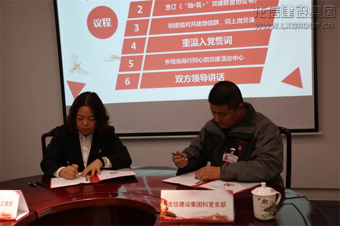 本次活動(dòng)以“融·筑+”黨建結(jié)對共建為主題,全體黨員共同重溫入黨誓詞,堅(jiān)定理想信念。龍信集團(tuán)科室支部副書記施金浩與海門農(nóng)商行機(jī)關(guān)第三黨支部書記劉曉艷共同簽訂《“融·筑+”黨建聯(lián)盟協(xié)議書》,以“黨建互促、服務(wù)互聯(lián)、專業(yè)互助、資源互享、廉政互督”為原則建立聯(lián)系、加強(qiáng)溝通,實(shí)現(xiàn)信息共享、優(yōu)勢互補(bǔ)?,F(xiàn)場黨員們共同創(chuàng)建“融·筑+”黨建結(jié)對共建微信群,同上“微黨課”《讓信仰之光在心中閃亮》。隨后大家重溫入黨誓詞并參觀海門農(nóng)商銀行同心圓黨建活動(dòng)中心。
