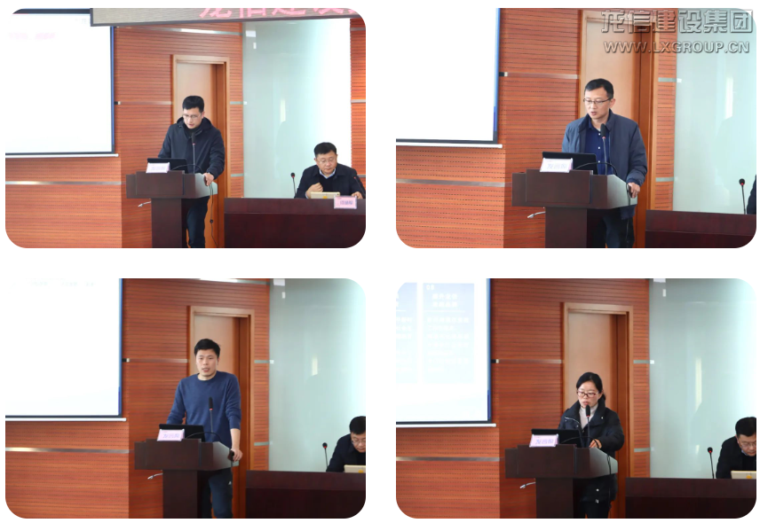 (左上:集團(tuán)副總、總工程師殷廣玉匯報(bào)技術(shù)質(zhì)量條線工作;右上:集團(tuán)副總趙同慶匯報(bào)經(jīng)營(yíng)條線工作;左下:集團(tuán)財(cái)務(wù)總監(jiān)樊錦杰匯報(bào)財(cái)稅條線工作;右下:集團(tuán)黨委副書記、工會(huì)主席蔡颯爽匯報(bào)黨委行政人事法務(wù)工作。)