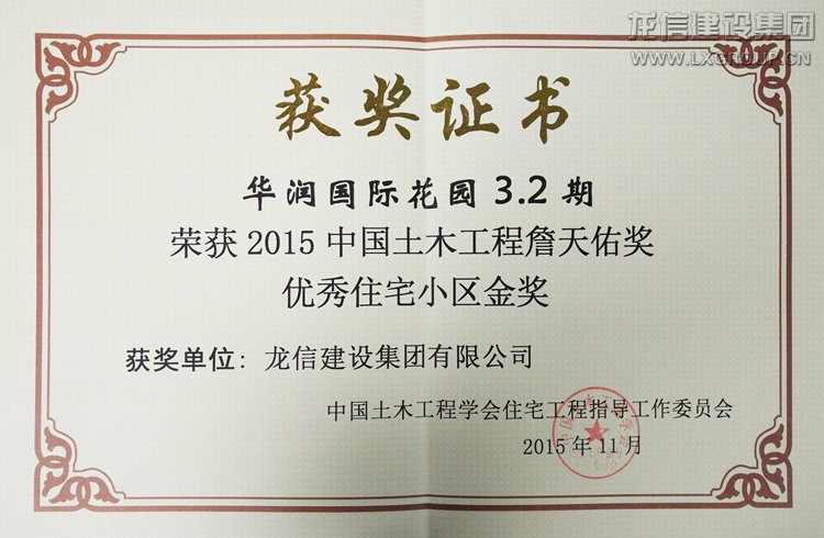 11月6日-8日,中國土木工程學會在北京召開“2015中國土木工程詹天佑獎優(yōu)秀住宅小區(qū)技術交流會”,龍信建設集團有限公司承建的“華潤國際花園3.2期”項目榮獲2015年度中國土木工程詹天佑獎優(yōu)秀住宅小區(qū)金獎,協(xié)會領導為公司頒發(fā)榮譽證書。